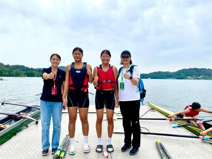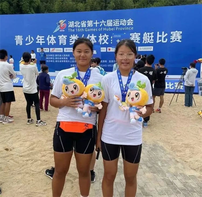 乙组女子双人双桨:领桨手李宜萌,跟桨手邓雅芮。两人都是07年出生,平均身高181㎝,身材匀称,肩宽臂长,两人凭借默契的配合,从预赛小组第一直接进入决赛,并把这个优势一直保持到决赛,为宜昌代表队再添一枚压轴金牌。