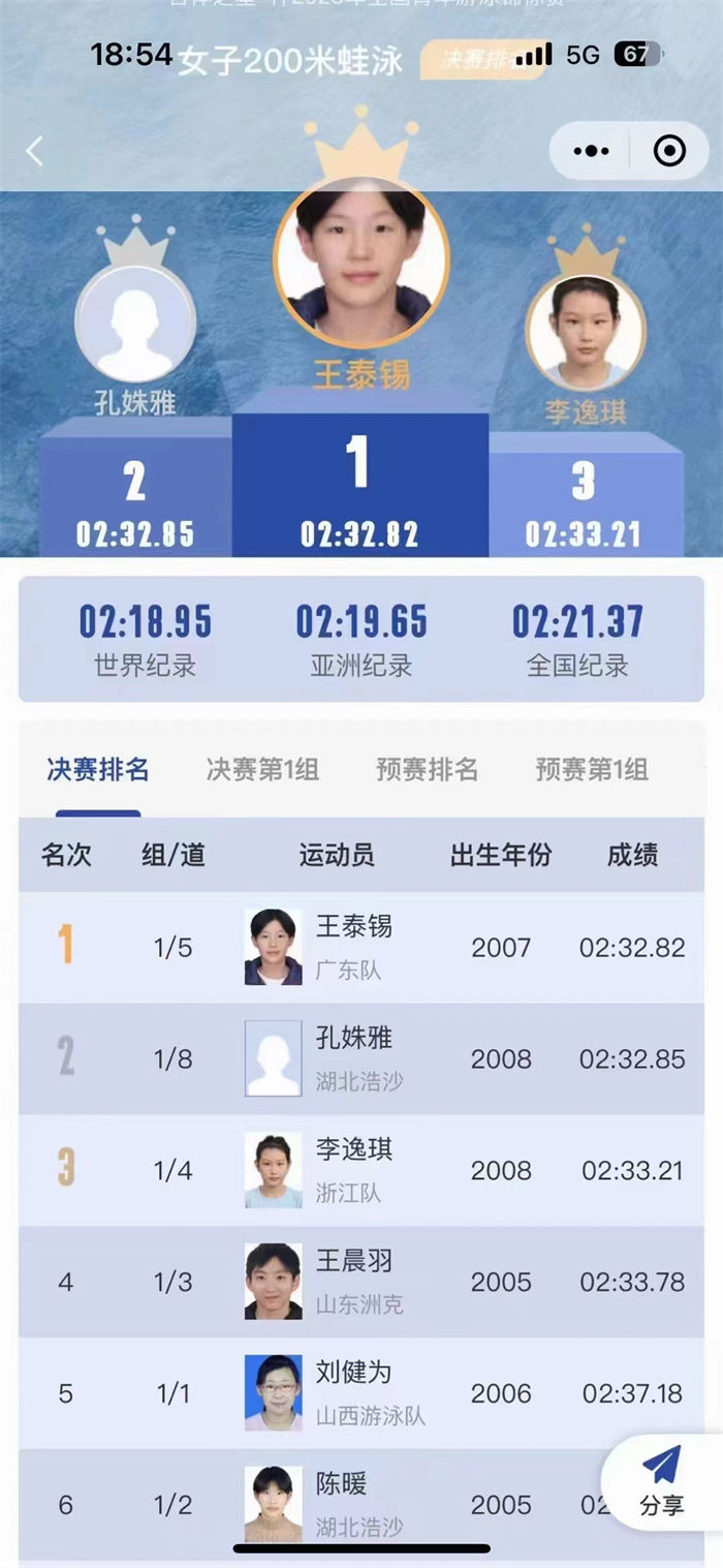 宜昌游泳新星14岁孔姝雅斩获全国青年游泳锦标赛200米蛙泳银牌
