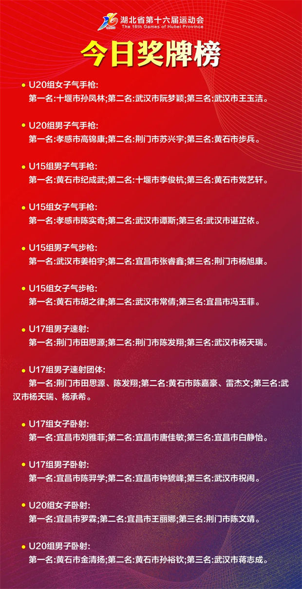 下午14.45分,随着10米靶场U15组气步枪比赛的结束,湖北省第十六届运动会青少年体育类(体校组)射击比赛4月9日11场比赛顺利结束,决出了12个项目的奖牌。