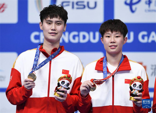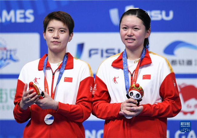 8月7日,亚军夏玉婷/杜玥(左)在颁奖仪式上。新华社记者 张端 摄