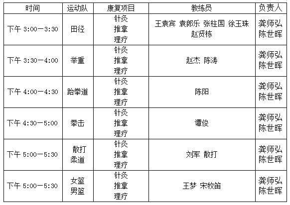 1、科研室每天按照时间顺序接待每个项目的伤病员进行理疗和康复。每天有伤病运动员在治疗时,必须保证科研人员和医师有一名在场指导。时间安排如下: