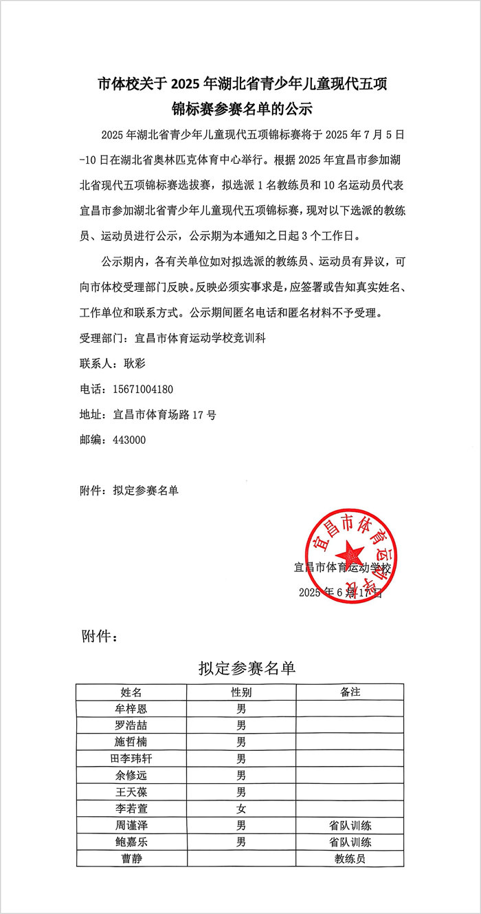 市体校关于2025年湖北省青少年儿童现代五项锦标赛参赛名单的公示