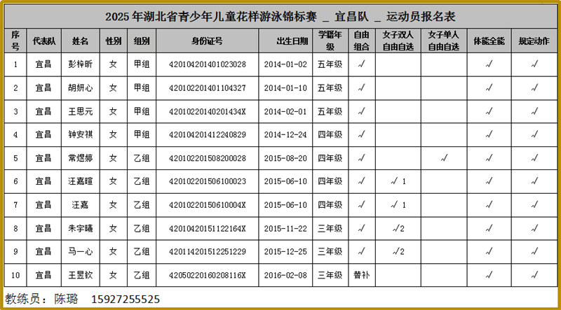 2025年湖北省青少年花样游泳锦标赛将于2025年8月11日-8月13日在湖北省十堰市举行。拟选派1名领队1名教练员和10名运动员参加,拟参加名单见附件。