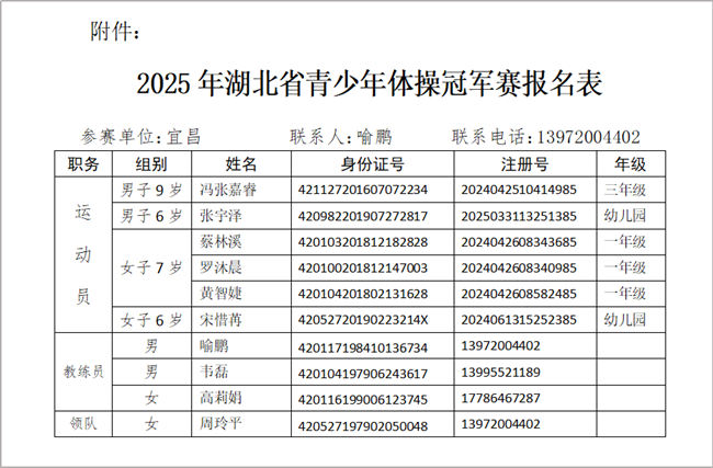 2025年湖北省青少年体操冠军赛,将于2025年8月13日-8月16日在湖北省孝感市举行。根据2025年湖北省青少年体操冠军赛赛前选拔成绩,拟选派1名领队3名教练员和名6运动员参加,拟参加名单见附件。
