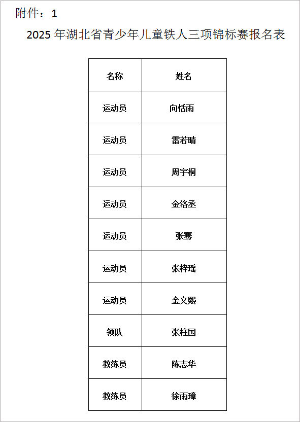 2025年湖北省青少年儿童铁人三项锦标赛,将于2025年8月27日-8月29日在湖北省鄂州市举行。根据2025年湖北省青少年儿童铁人三项锦标赛赛前选拔成绩,拟选派1名领队2名教练员和名7运动员参加,拟参加名单见附件。
