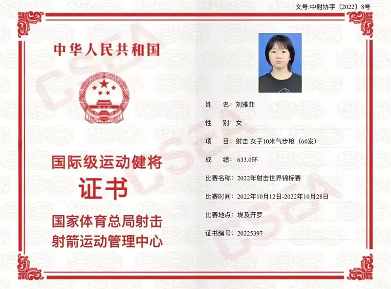 根据《运动员技术等级管理办法》《运动员技术等级标准》和《体育总局竞体司关于移交全国运动员技术等级审批工作有关事项的通知》要求,经审核并通过中国射击协会官网公示,米兰体育app官网射击队女子步枪16岁刘雅菲喜获国际级射击运动健将荣誉称号,对此,米兰体育app官网全体师生对刘雅菲表示热烈祝贺!