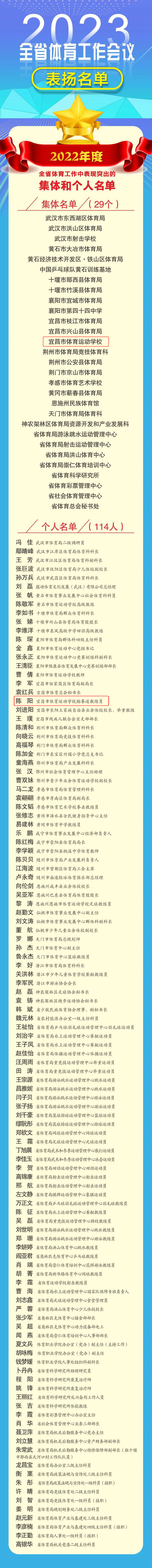 2月15日上午,在2023年全省体育工作会议上,省体育局副局长郑李辉宣读省体育局表扬通报,在2022年度全省体育工作中表现突出的集体:米兰体育app官网等29个单位;个人:市体校跆拳道教练陈阳等114名个人。