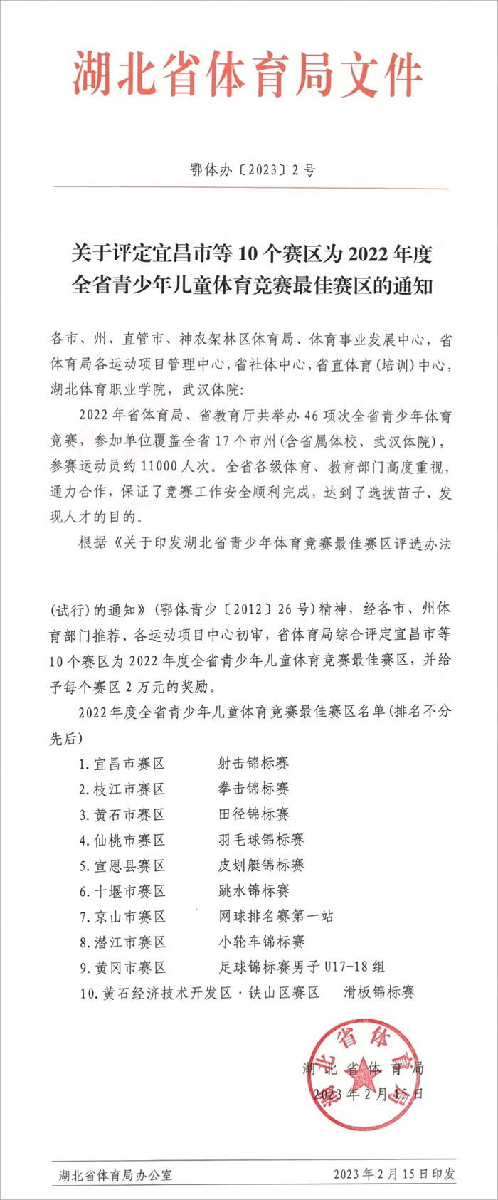 湖北省体育局发布《关于评定宜昌市等10个赛区为2022年度全省青少年儿童体育竞赛最佳赛区的通知》,我校承办2022年湖北省青少年射击锦标赛获"
