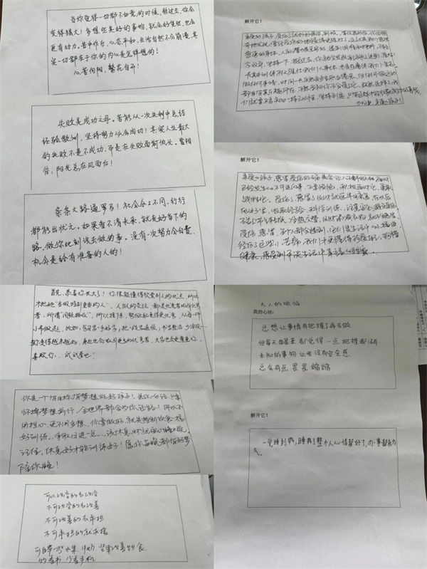 米兰体育同时采用调查问卷的形式,让学生写下自己的心结,老师阅读学生的心声并帮助答疑解惑,帮助学生从“山重水尽疑无路”的苦闷转向“柳暗花明又一村”的明媚心境。