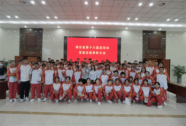 6月16日,宜昌市委市政府隆重召开湖北省第十六届运动会宜昌总结表彰大会,对在湖北省第十六届运动会等重大体育赛事筹办工作中,作出突出贡献的27个集体、57名个人给予及时奖励和通报表扬。市文化和旅游局、市委宣传部、市公安局、团市委等先进代表和先进教练员代表雷东梅、先进运动员代表刘雅菲发言。省十六运会筹委会相关单位、各县市区及有关高校负责同志,获得金牌运动员、教练员代表,受表彰人员代表参加了会议。