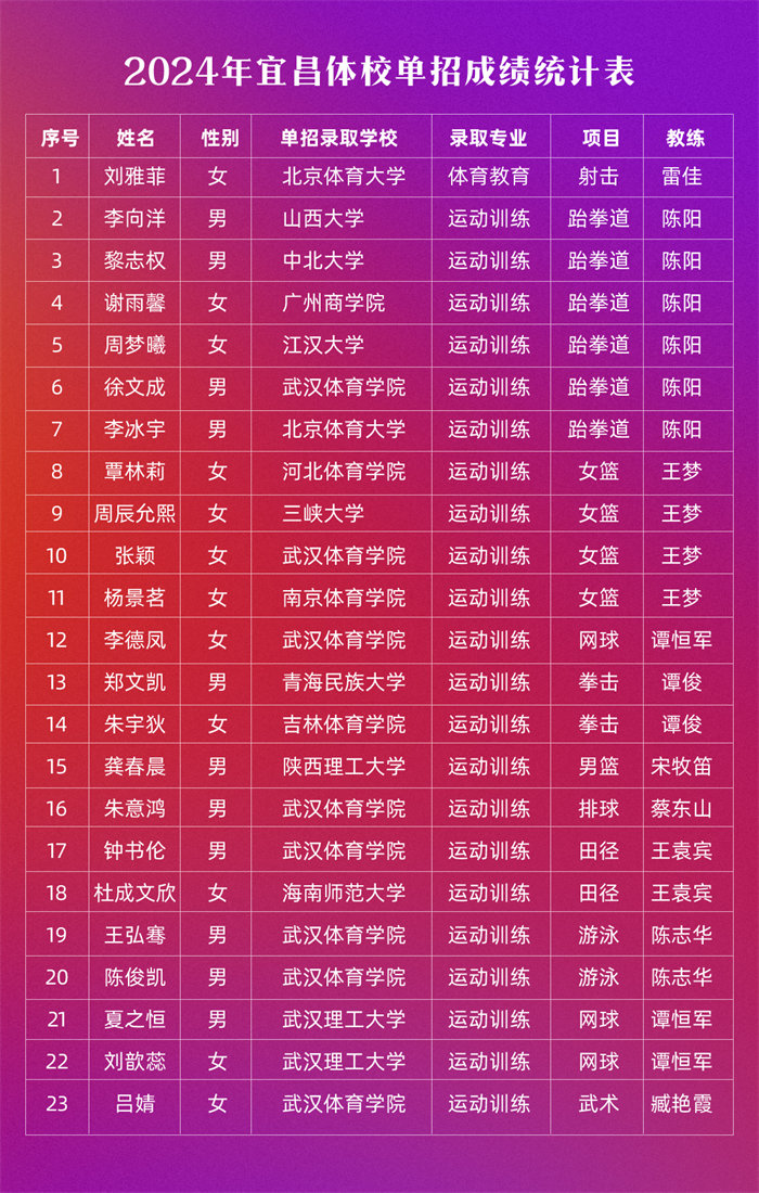 近日,全国普通高等学校运动训练、武术与民族传统体育专业统一招生考试(简称“体育单招”)成绩揭晓,我校学子捷报频传!刘雅菲、李向洋等23名体校学子凭借出色的表现,成功被北京体育大学、武汉理工大学、海南师范大学等多所知名本科院校录取。