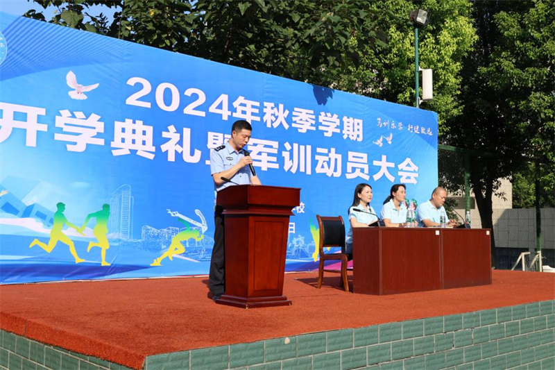 宜昌市公安局反恐特警支队党委委员、副支队长陈鹏讲话。他指出军训对培养学生纪律性和意志力的重要性,通过严格的军训,同学们能够更好地理解团队精神,锻炼身体素质,增强抗压能力,鼓励同学们在军训中积极表现,用实际行动展现青春的朝气和坚韧的品格。