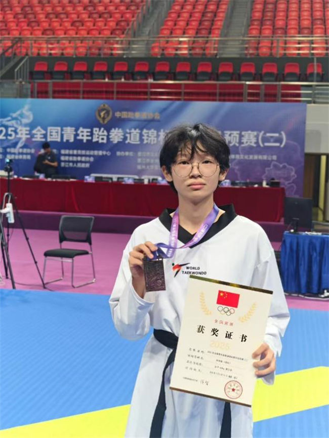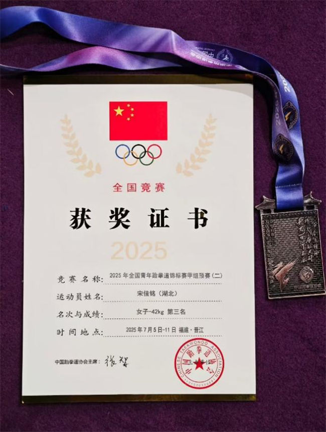 7月5日至11日,2025年全国青年跆拳道锦标赛甲组预赛(二)在福建晋江激情开赛。来自全国各地的近300名青年跆拳道选手齐聚一堂,展开了一场场激烈的角逐。米兰体育跆拳道队运动员宋佳铭在本次比赛中表现出色,夺得女子42公斤级铜牌,为家乡和学校争得了荣誉。